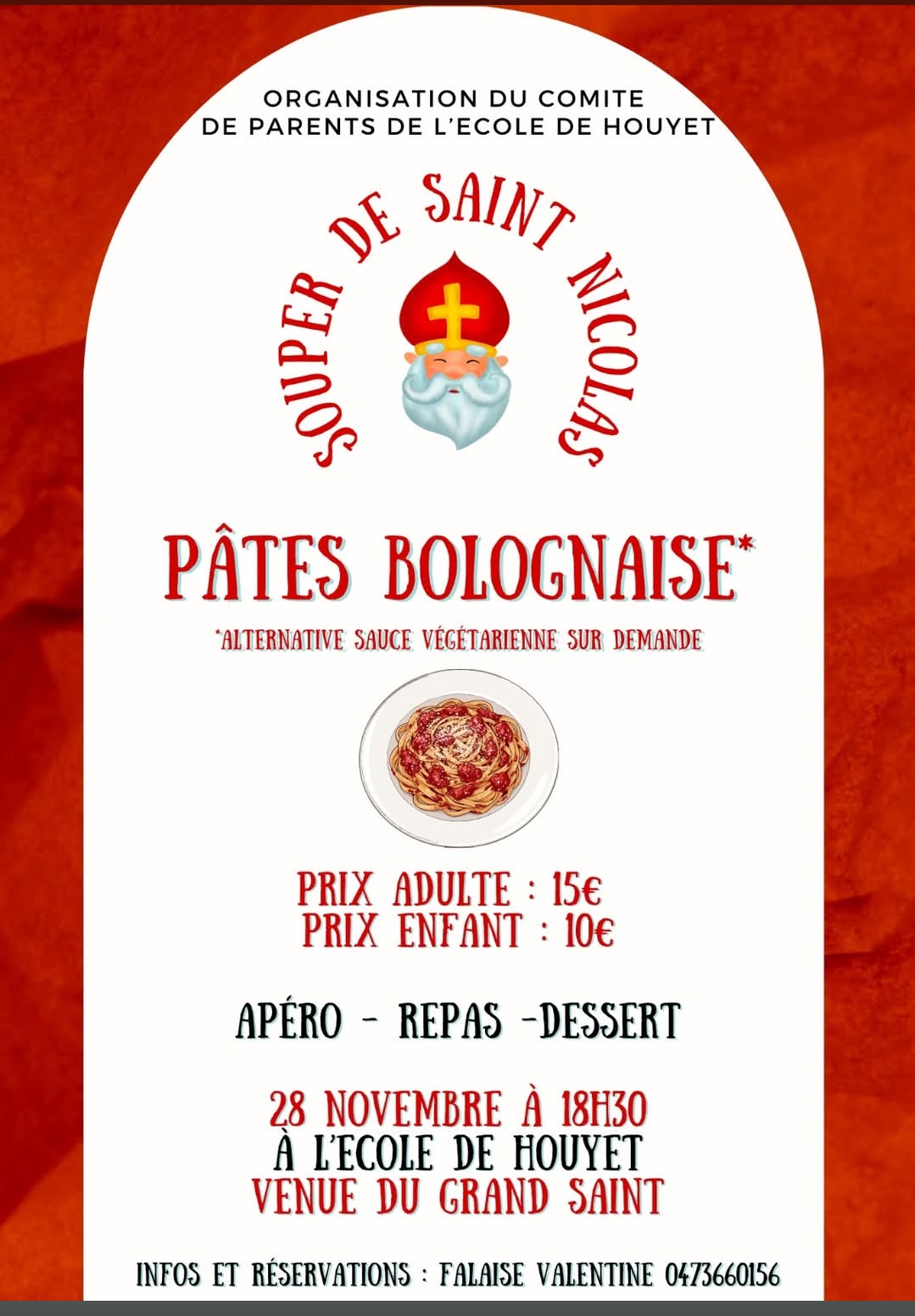 Souper de Saint Nicolas organisé par le Comité des parents de l’école de Houyet, à l’école de Houyet. Souper Pâtes bolognaise (alternative sauce végétarienne sur demande) au prix de 15 eur pour adulte et 10 eur pour enfant (apéro, repas, et dessert). Infos et réservations auprès de V. Falaise: 0473/66.01.56. Venue du Grand Saint !
